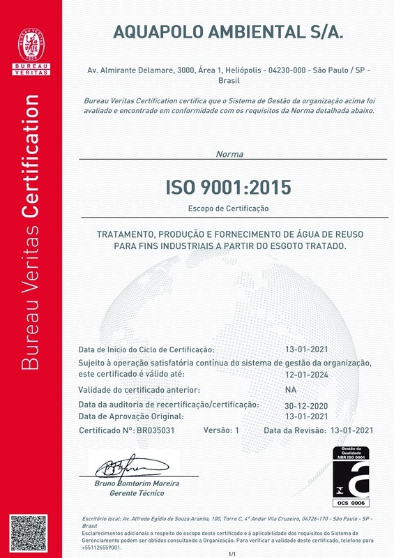 O Aquapolo, resultado de parceria entre a GS Inima Industrial e a SABESP e maior empreendimento para a produção de água de reuso industrial na América do Sul, acaba de conquistar a certificação ISO 9001:2015